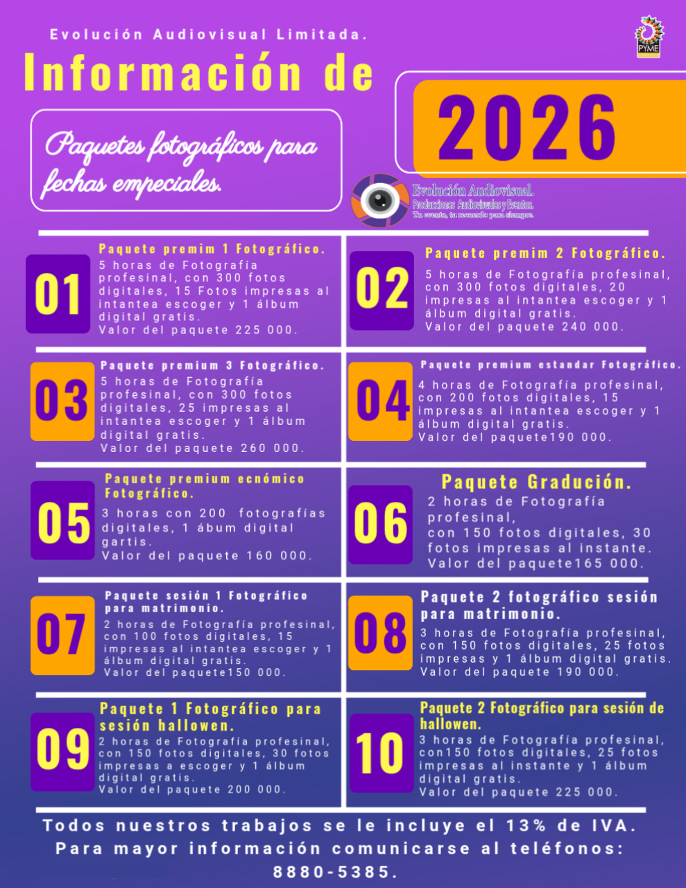 En Evolución Audiovisual nos especializamos en la producción, post producción audiovisual y fotografía profesional. Capturamos los momentos más importantes de tu vida y los convertimos en recuerdos inolvidables. Nuestros servicios están dirigidos a todo tipo de negocio u organización, ya sea que necesites un video corporativo o una sesión de fotos para tu empresa, o si buscas inmortalizar un momento especial en tu vida familiar.